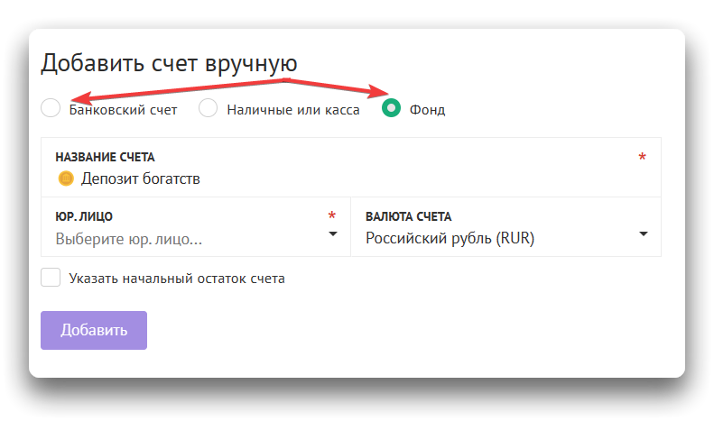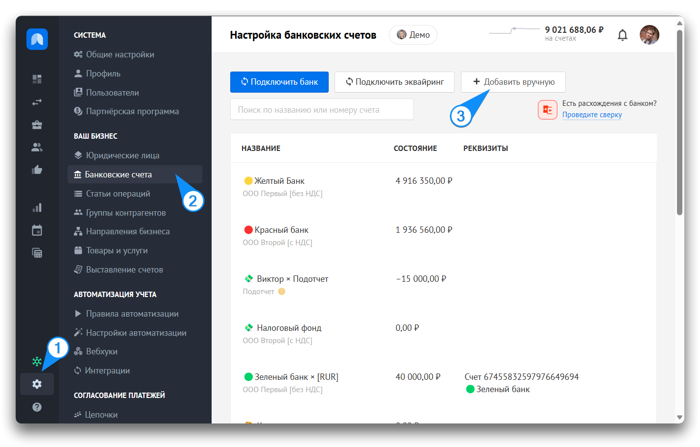 - В разделе Настройки → Банковские счета добавьте новый счет вручную: