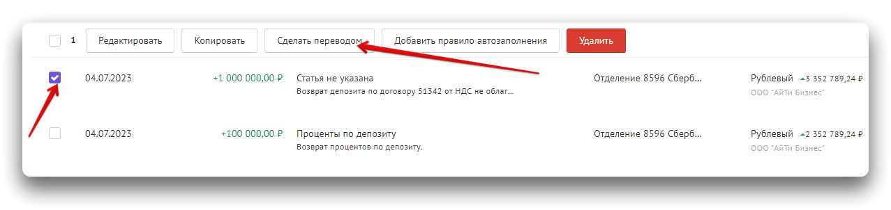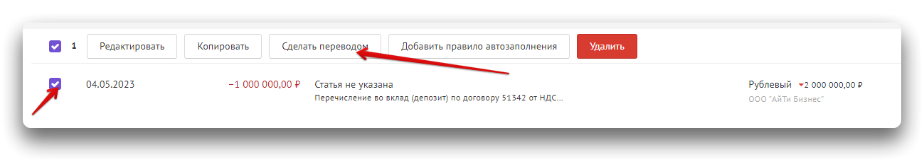 - Когда переводите средства на депозит или пополняете его, по основному счёту приходит выплата. Преобразуйте ее в перевод (перевод с Основного счёта на Депозит):