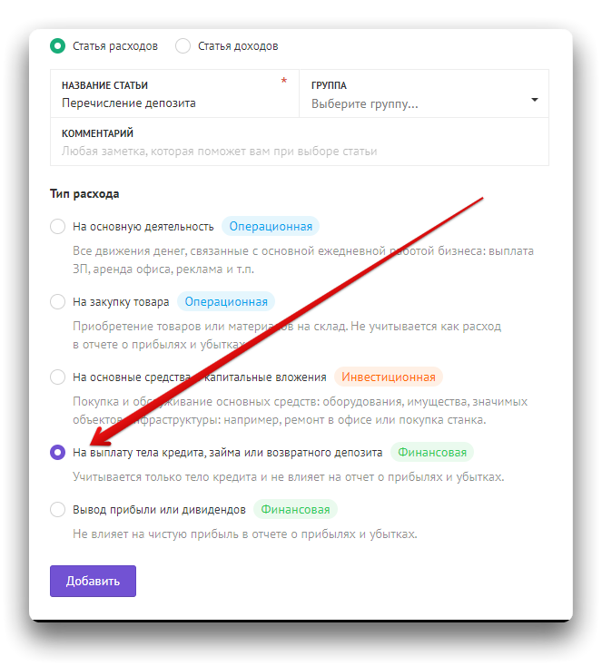 Отражать депозит так же можно с помощью создания статей с финансовым видом деятельности в доходах и расходах. 💡Как создать статью операций, мы рассматриваем в инструкции Статьи доходов и расходов.