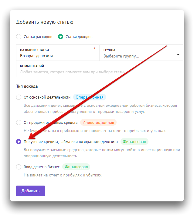 - Заведите статью доходов Возврат депозита так же с финансовым видом деятельности. На эту статью относите операции, когда банк вернул вам основную сумму депозита: