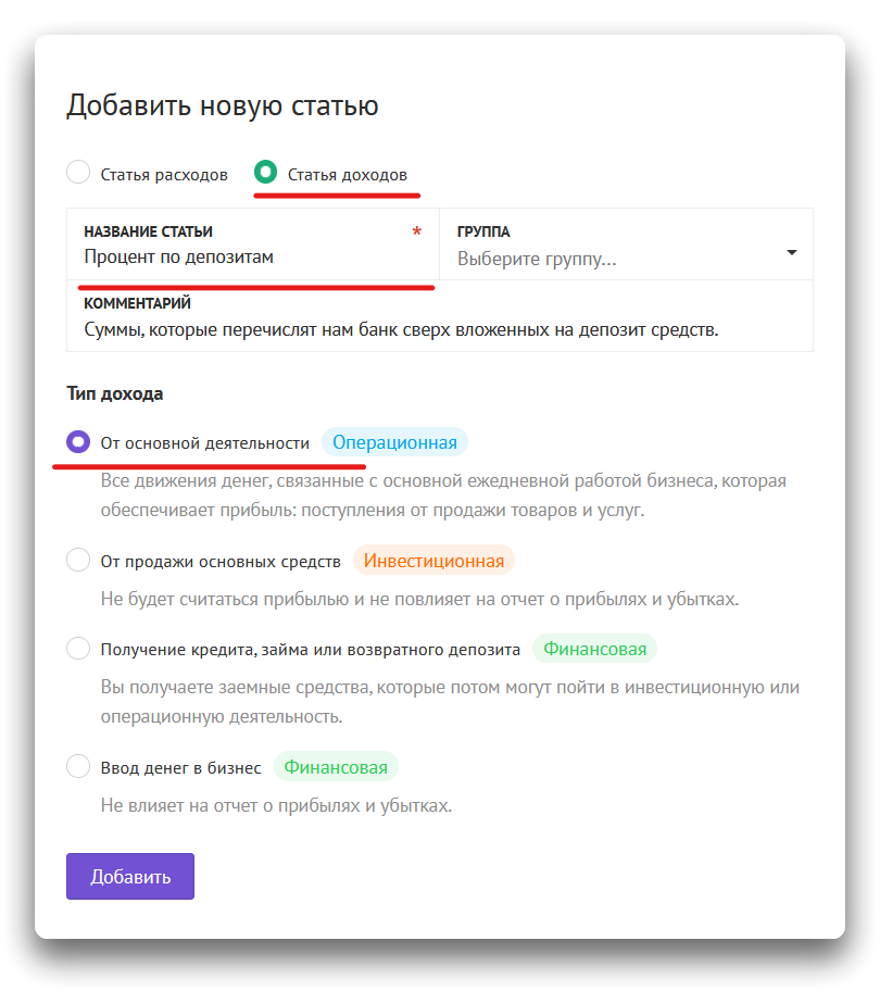 - Для отражения процентов нужно завести статью в доходах в разделе Настройки → Статьи операций, тип дохода указывайте Операционный