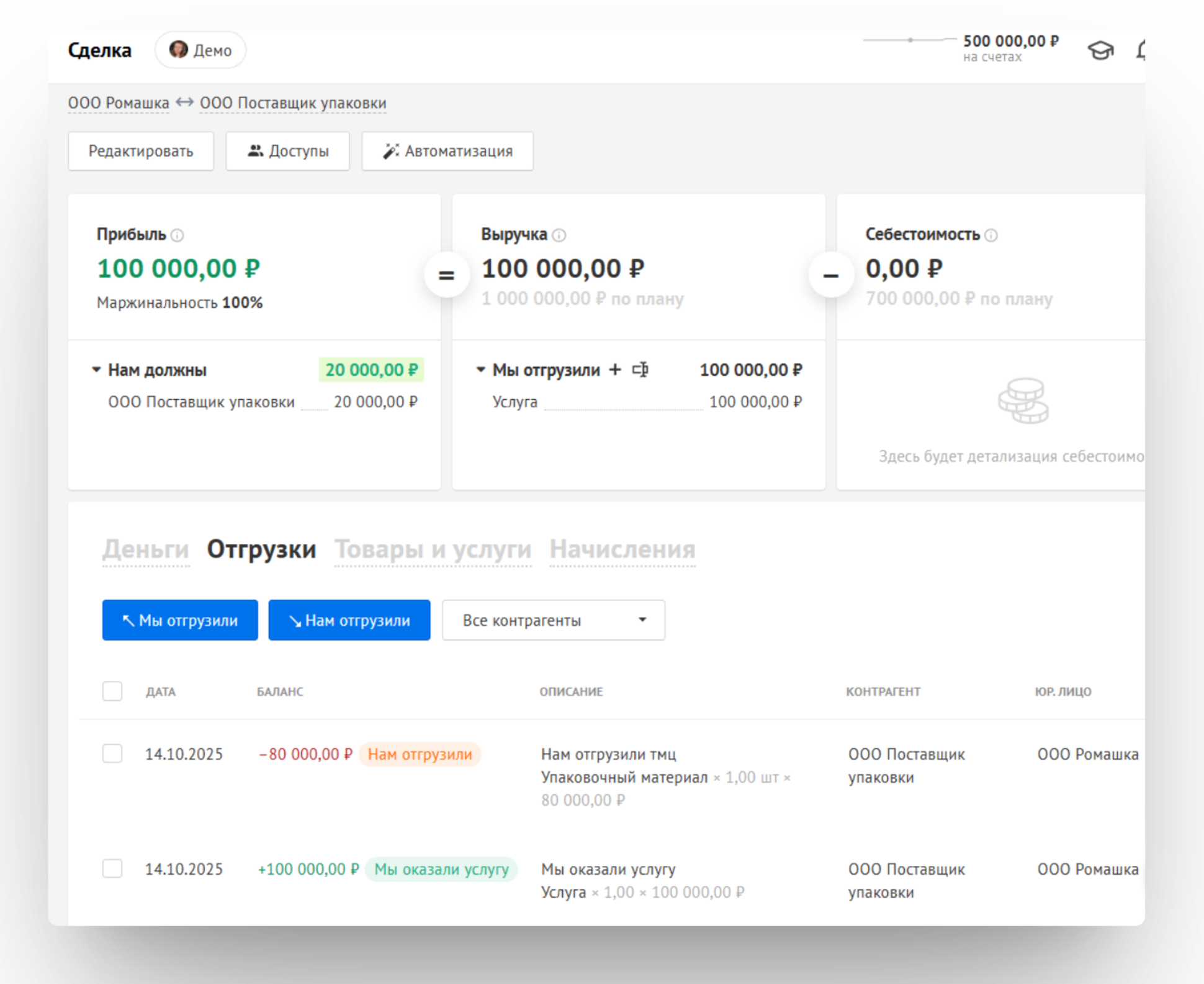 Нам необходимо зафиксировать факт оказания услуг контрагенту и факт получения товара от него. Для этого на основании подписанных актов выполненных работ (или оказанных услуг) мы оформим обязательства в виде отгрузок в Сделке "Взаимозачет":