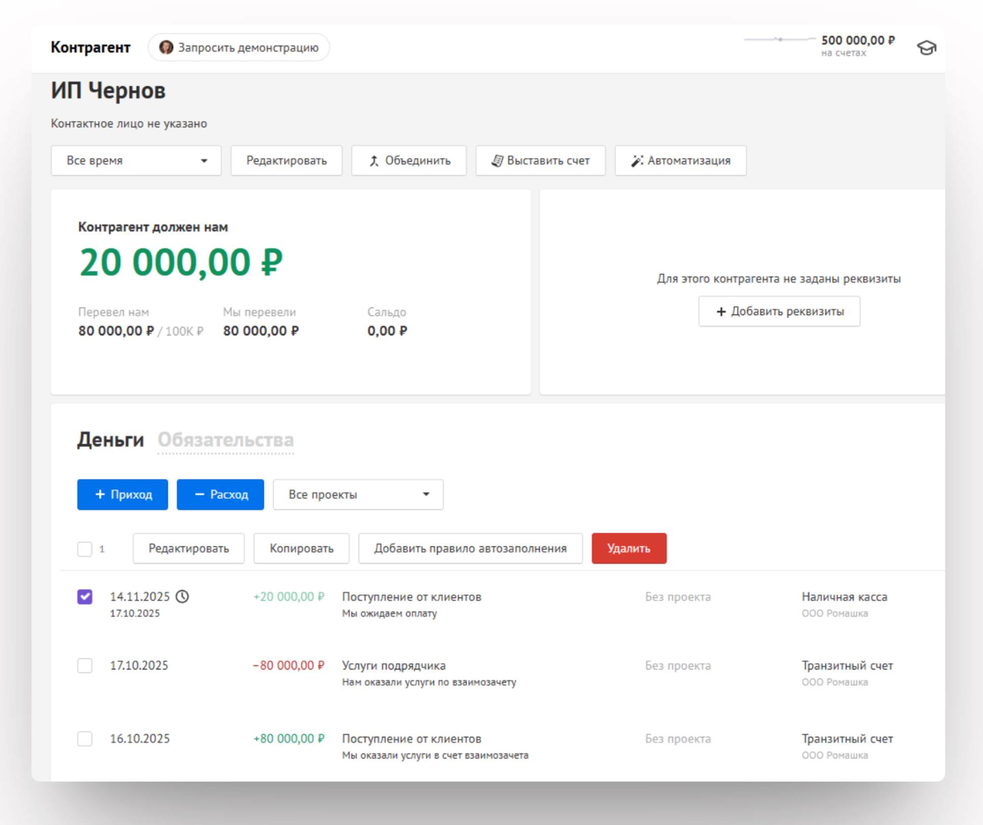 В карточке Контрагента будет выглядеть так: движений денег пока нет, обязательства взаимно закрывают друг друга, но сформирована задолженность на остаток долга плановым поступлением денег в будущем: