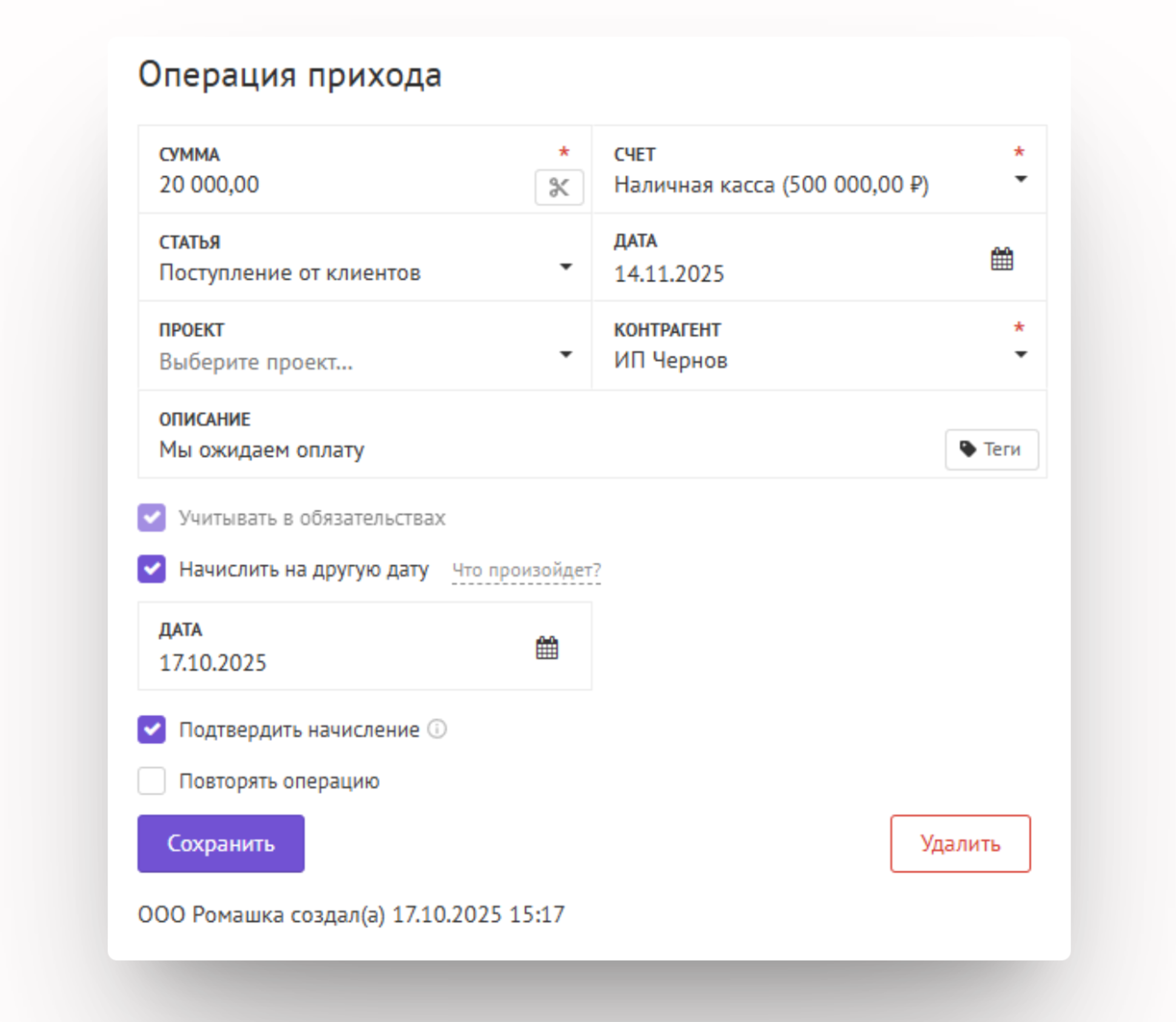 В проекте во вкладке "Деньги" мы отразили плановое поступление: