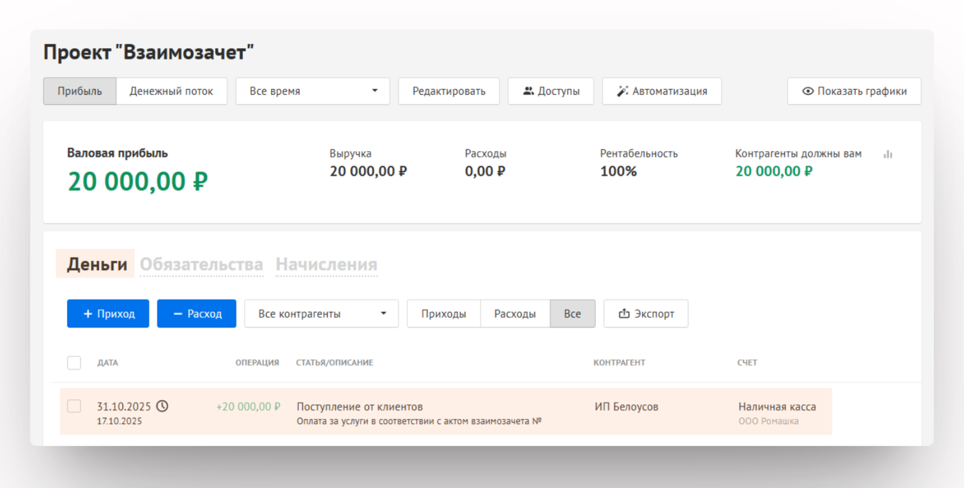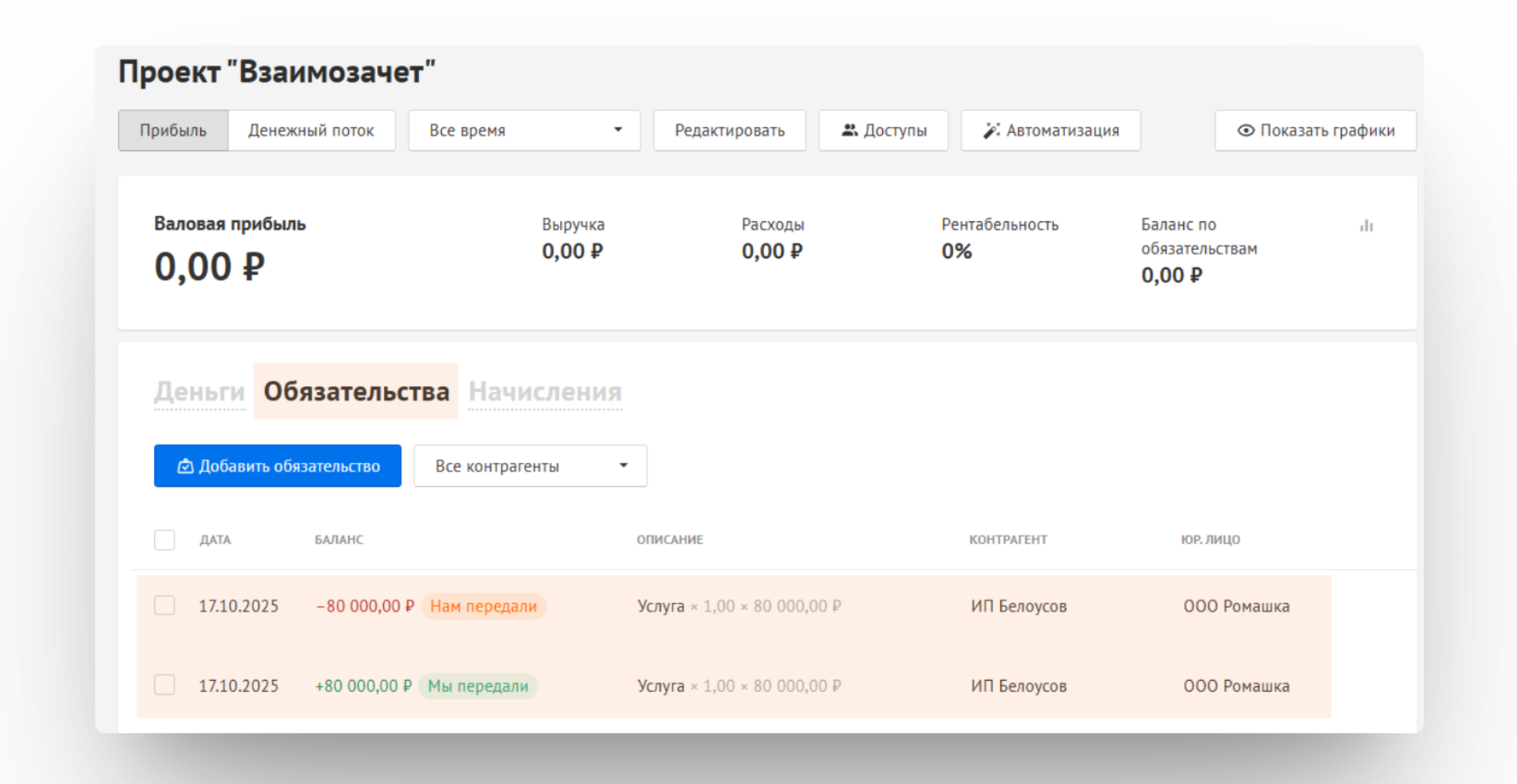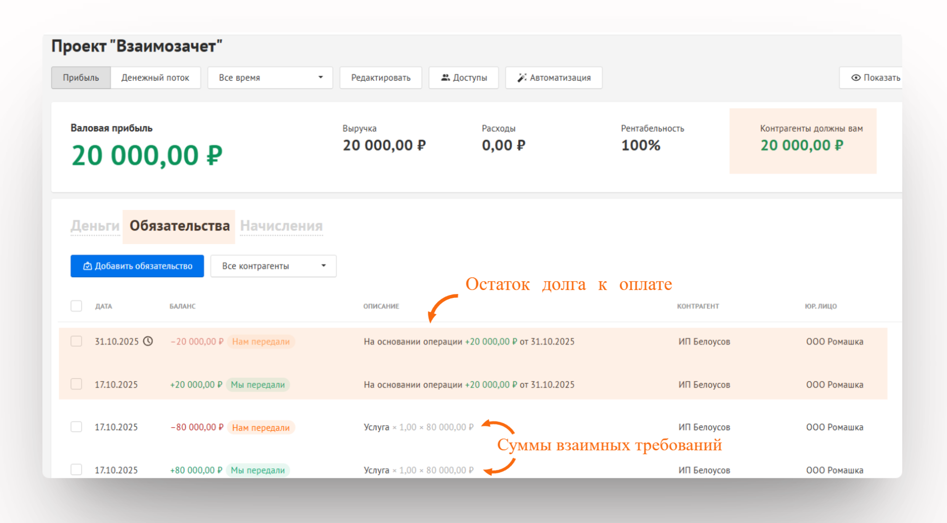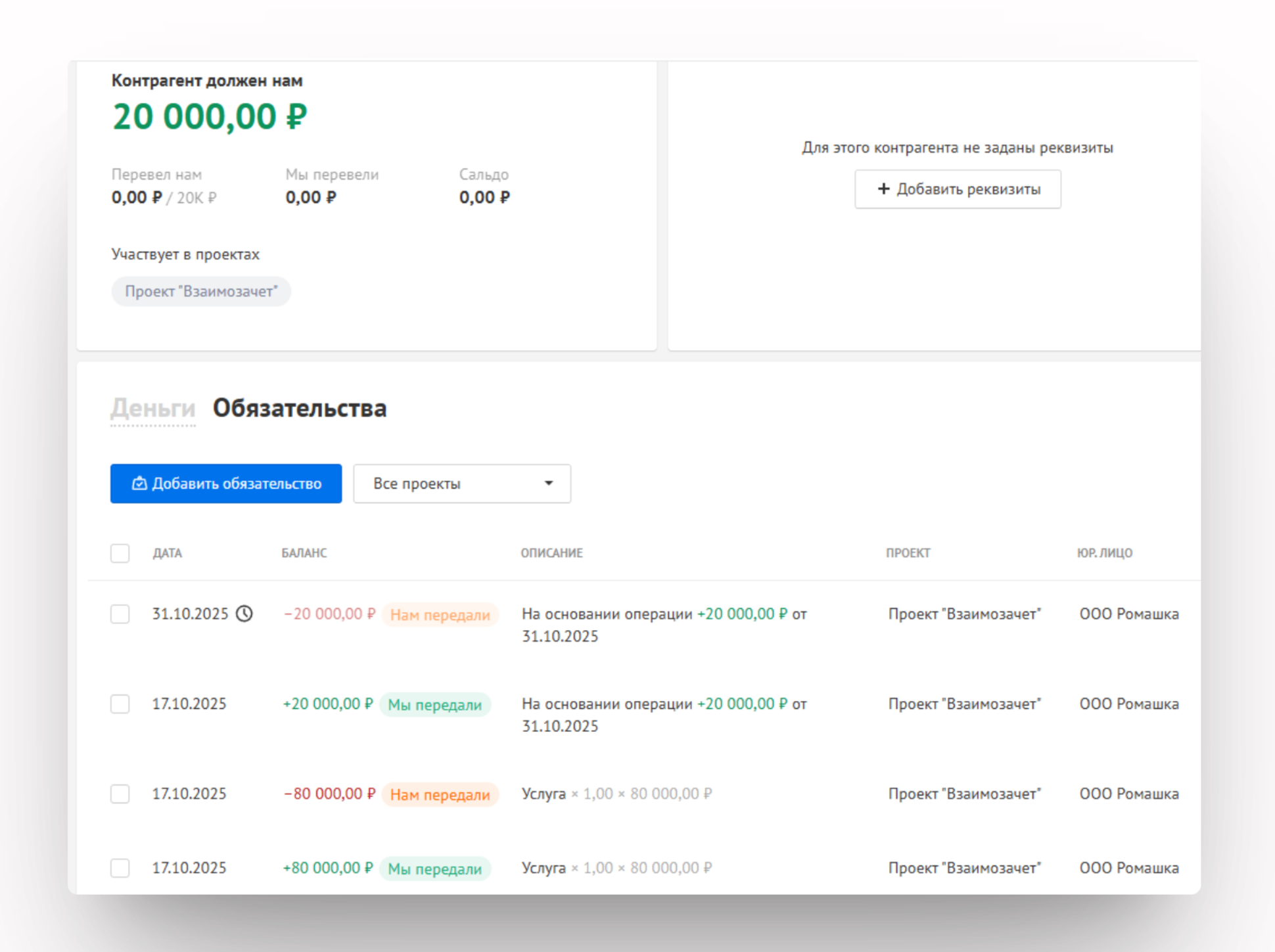 Нам необходимо зафиксировать факт оказания услуг контрагенту и факт получения услуг от него. Для этого на основании подписанных актов выполненных работ (или оказанных услуг) мы оформим обязательства в виде обязательств в Проекте "Взаимозачет":