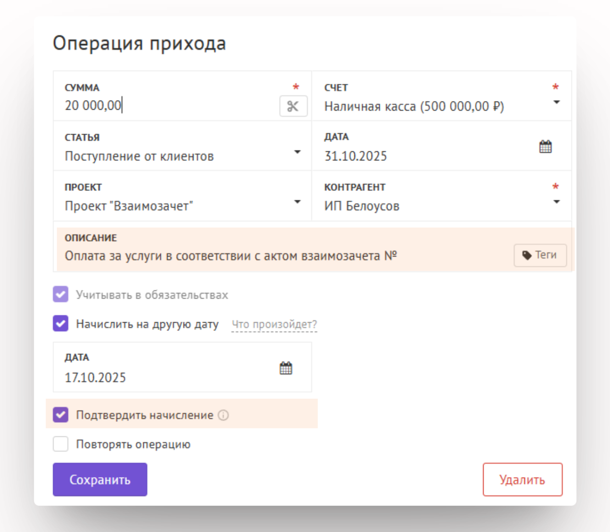 При этом плановое поступление от контрагента на оставшуюся сумму необходимо отразить с учетом обязательств и подтвердить начисление на дату подписанного акта: