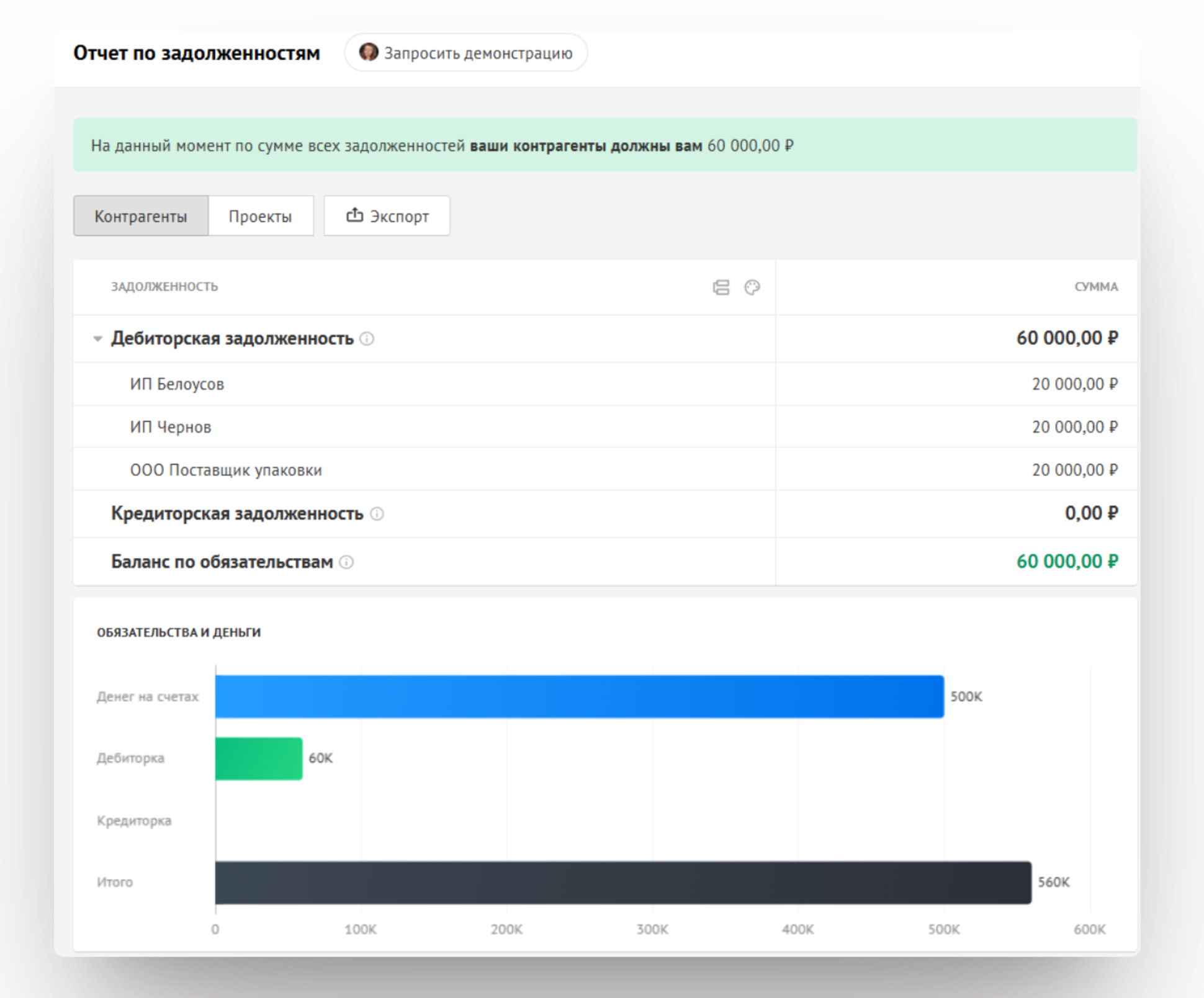 Разница между обязательствами с данными контрагентами будет отражена и в Балансе, и в Отчете о задолженностях в соответствующей группе задолженности: