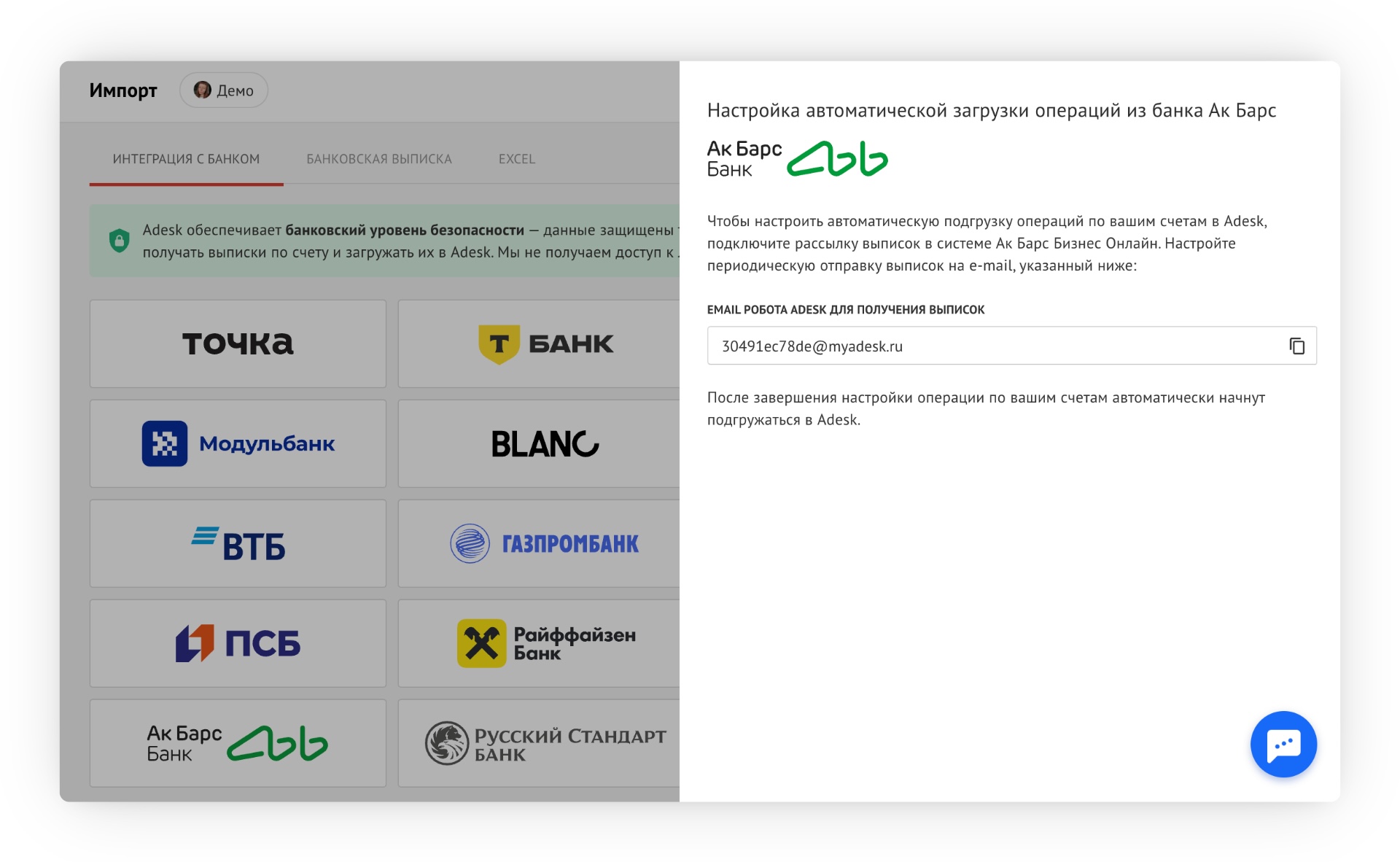 Вам понадобится доступ к интернет-банку Ак Барс и электронный адрес вашего робота Adesk для получения выписок.