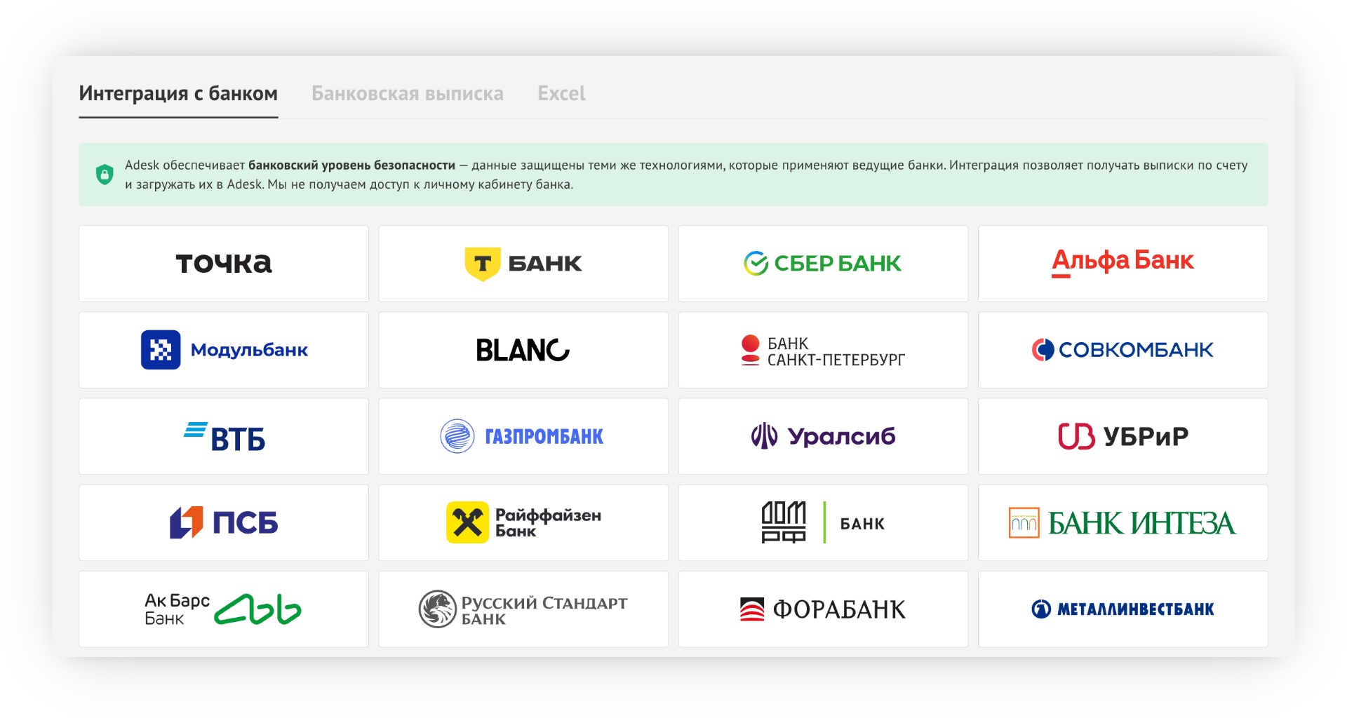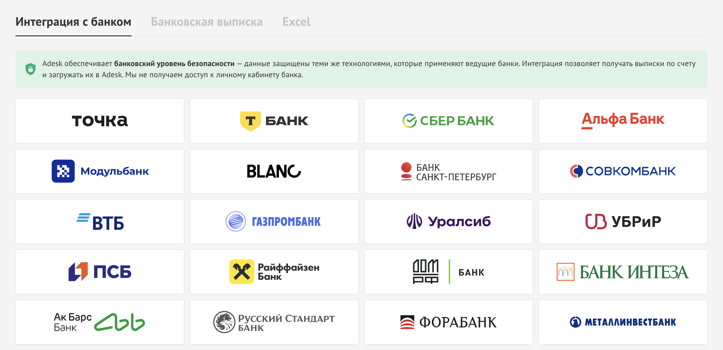 Новые операции по вашим счетам автоматически начнут подгружаться в Adesk утром следующего банковского дня.
