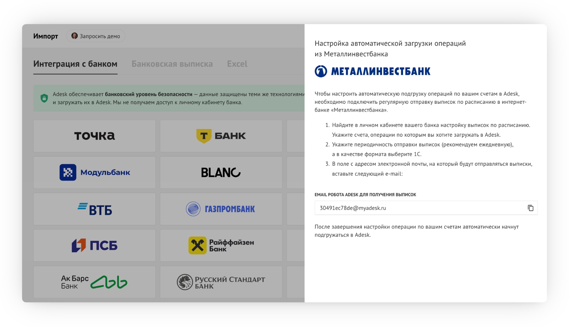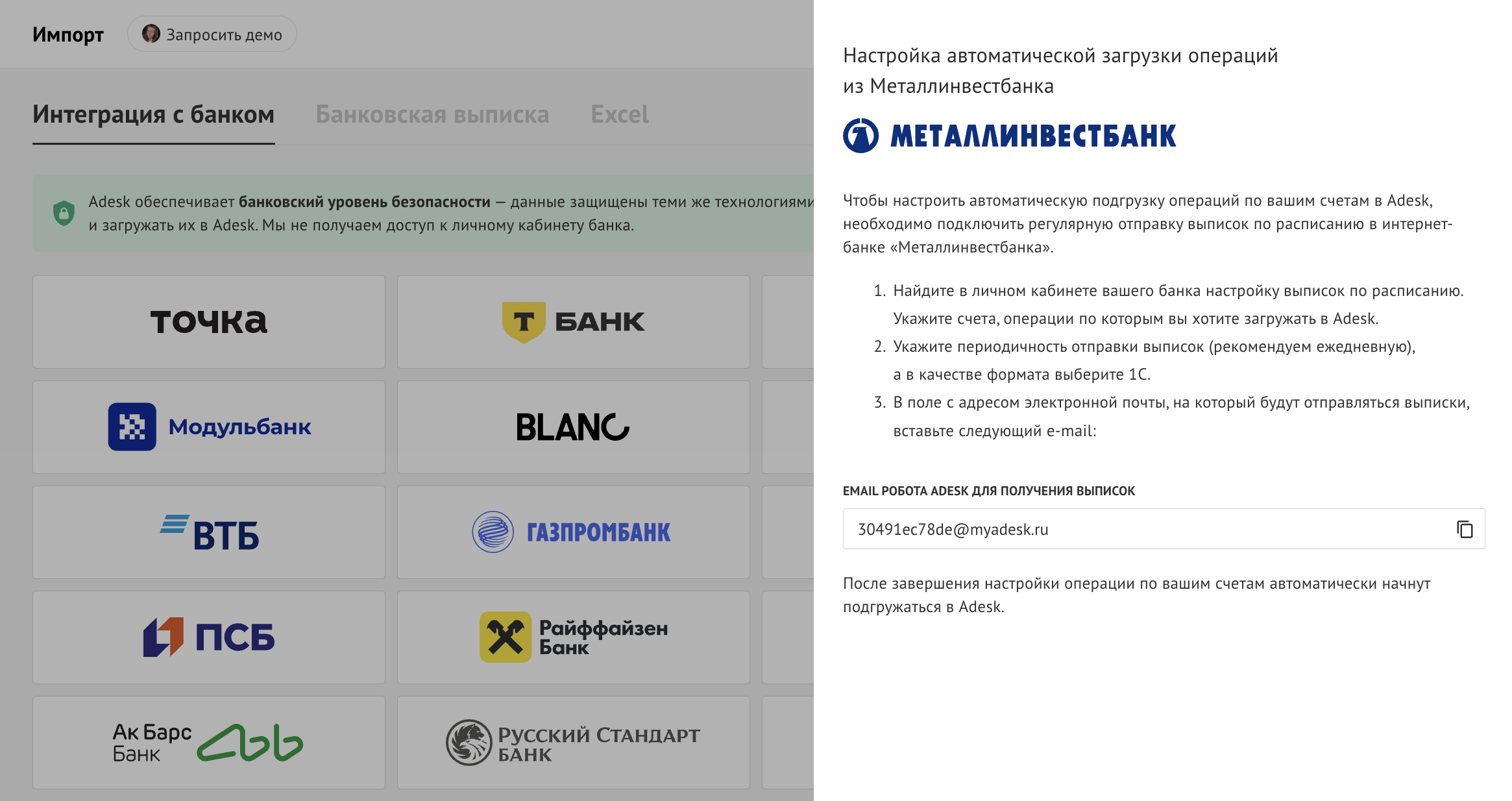 Вам понадобится доступ к интернет-банку Металлинвестбанк и электронный адрес вашего робота Adesk для получения выписок.