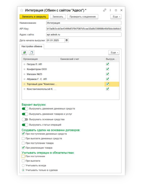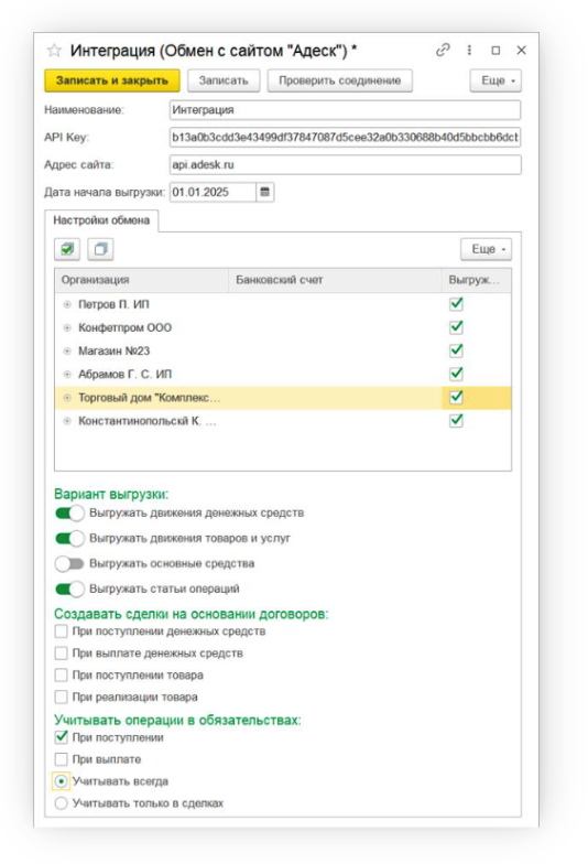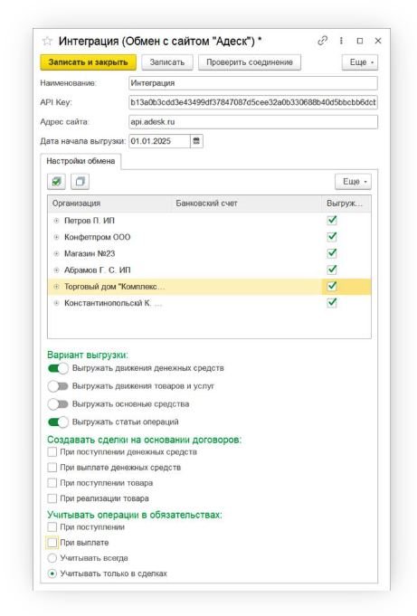 Выбрать необходимые юрлица и счета для выгрузки